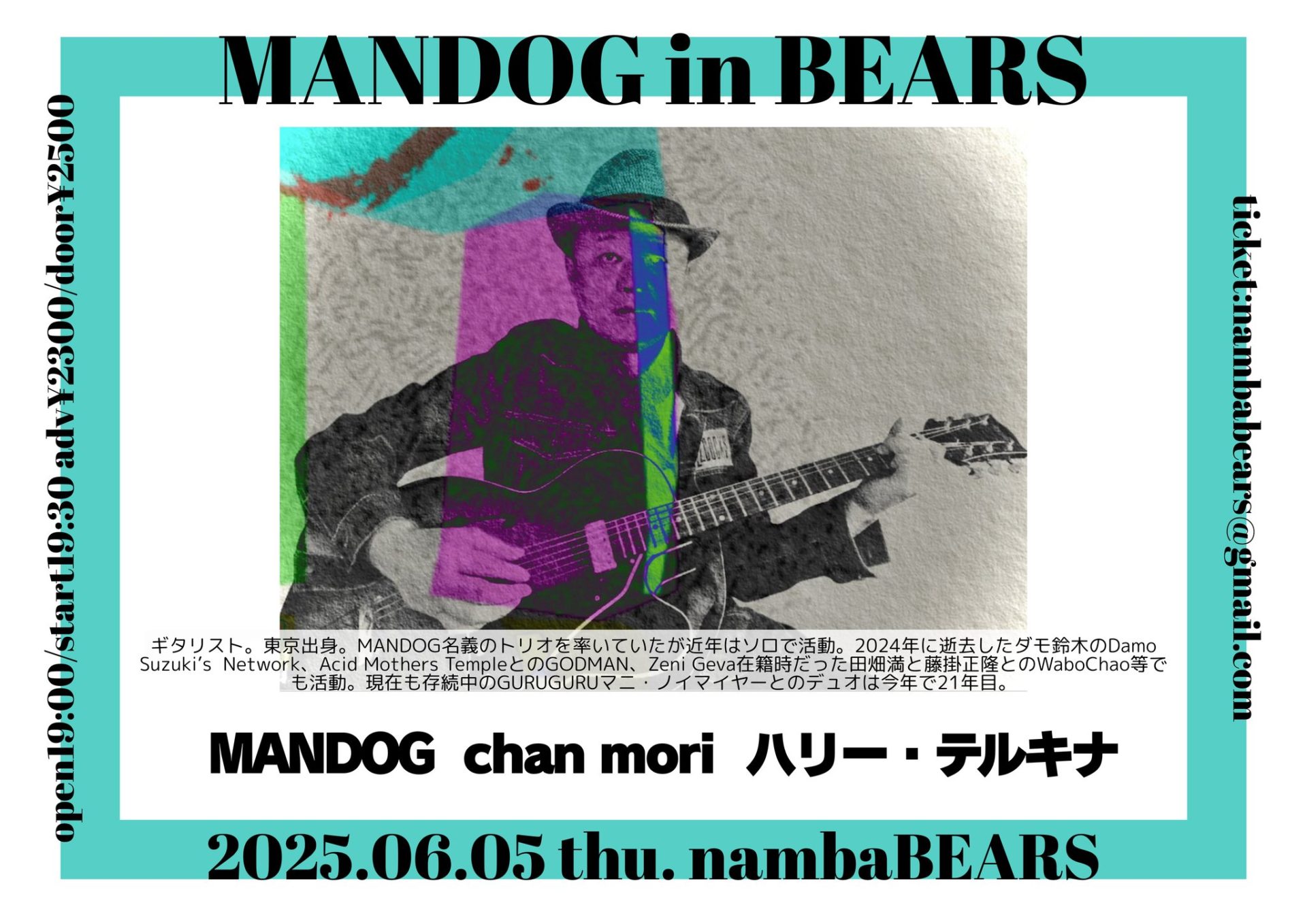 2025.06.05(Thu) MANDOG in BEARS 2025.05.20 6月5日(木)難波ベアーズ •MANDOG(東京) •chan mori •ハリー・テルキナ open19:00/start19:30 adv¥2300/door¥2500 BEARS〒556-0011 大阪府大阪市浪速区難波中3丁目14−5 新日本難波ビル B1